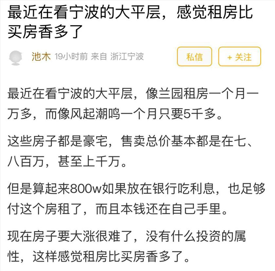 近日,东论网友@池木称自己在看宁波的大平层,从租金来看,他感觉租房比买房香多了~