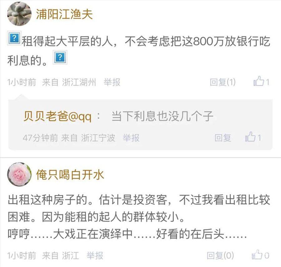 而对于租还是买,有网友则认为,可以租得起大平层的人群,也不会把800万放银行吃利息…